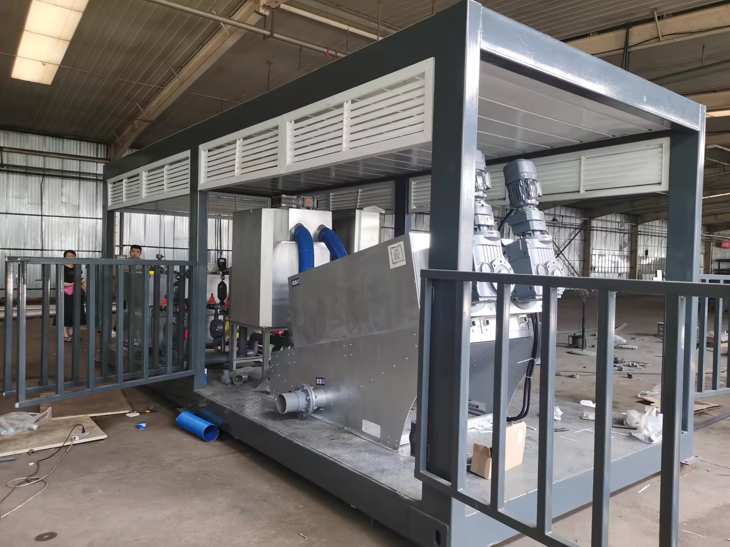 簡易的污泥脫水間是把疊螺機(jī)以及PAM三槽一體自動加藥裝置以及加藥泵,控制系統(tǒng)都集成在一起,上面采用頂棚防雨雪,四周圍欄式開關(guān)設(shè)計,不怕風(fēng)吹日曬,像是簡易的污泥脫水機(jī)房