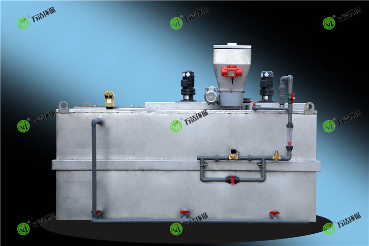 PAM加藥裝置的制備過程通過三級溶液箱逐級完成,溶液箱之間用擋板隔開,以保證每個溶液箱內的反應時間和恒定的濃度,避免產生溶解短路。干粉螺旋輸送機可以定量輸送粉劑保證制備濃度。